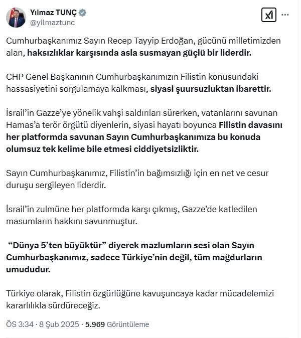 "Cumhurbaşkanımız Sayın Recep Tayyip Erdoğan, gücünü milletimizden alan, haksızlıklar karşısında asla susmayan güçlü bir liderdir. CHP Genel Başkanının Cumhurbaşkanımızın Filistin konusundaki hassasiyetini sorgulamaya kalkması, siyasi şuursuzluktan ibarettir. İsrail'in Gazze'ye yönelik vahşi saldırıları sürerken, vatanlarını savunan Hamas'a terör örgütü diyenlerin, siyasi hayatı boyunca Filistin davasını her platformda savunan Sayın Cumhurbaşkanımıza bu konuda olumsuz tek kelime bile etmesi ciddiyetsizliktir. Sayın Cumhurbaşkanımız, Filistin'in bağımsızlığı için en net ve cesur duruşu sergileyen liderdir. İsrail'in zulmüne her platformda karşı çıkmış, Gazze'de katledilen masumların hakkını savunmuştur. "Dünya 5'ten büyüktür" diyerek mazlumların sesi olan Sayın Cumhurbaşkanımız, sadece Türkiye'nin değil, tüm mağdurların umududur. Türkiye olarak, Filistin özgürlüğüne kavuşuncaya kadar mücadelemizi kararlılıkla sürdüreceğiz."
