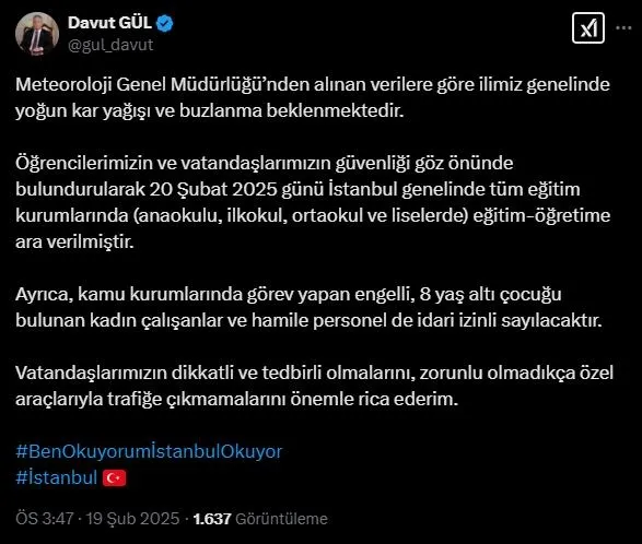 Öğrencilerimizin ve vatandaşlarımızın güvenliği göz önünde bulundurularak 20 Şubat 2025 günü İstanbul genelinde tüm eğitim kurumlarında (anaokulu, ilkokul, ortaokul ve liselerde) eğitim-öğretime ara verilmiştir.