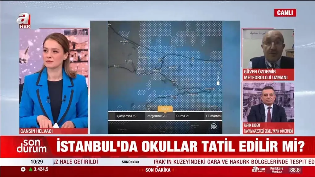 A Haber canlı yayınına katılan Meteoroloji Uzmanı Güven Özdemir, kar yağışının ani şekilde bastıracağını ve akşam saatlerine doğru buzlanma tehlikesi oluşabileceğini belirtti. Özdemir, bu nedenle okulların öğleden sonra tatil edilmesinin faydalı olabileceğini ifade etti. Özellikle sürücülerin dikkatli olması gerektiğine dikkat çeken Özdemir, “Bu kar yağışı ani şekilde bastıracak ve akşam saatlerine doğru buzlanma tehlikesi oluşabilir”dedi.