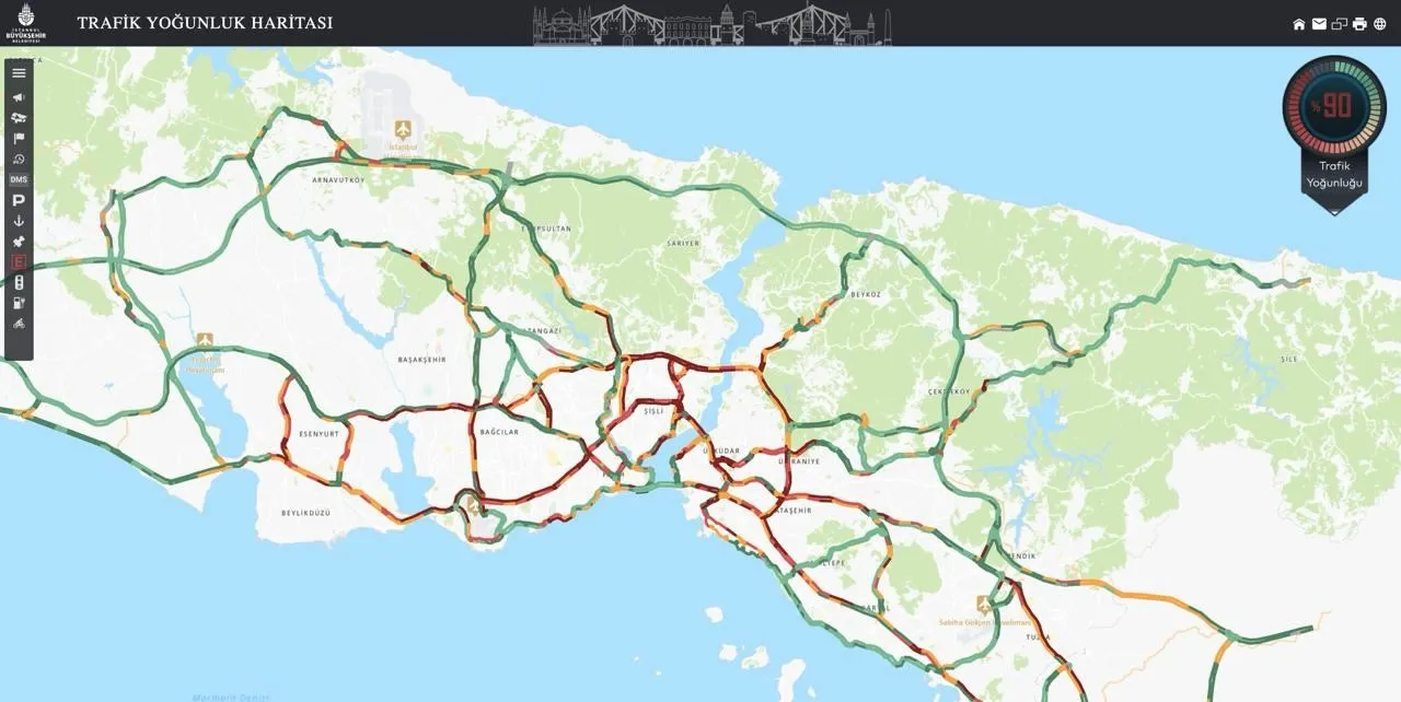 Öte yandan, İstanbul Büyükşehir Belediyesi (İBB) Cep Trafik uygulamasına göre, kent genelinde trafik yoğunluğu yüzde 90 olarak ölçüldü.
