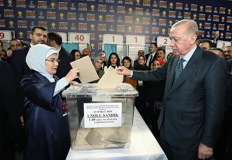 Ankara Spor Salonu'nda düzenlenen kongrede Genel Başkanlığa tekrar aday gösterilen Erdoğan, eşi Emine Erdoğan ile geldiği salonda, oyunu 1 No'lu sandıkta kullandı.