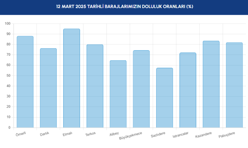 En düşük su oranına sahip baraj Sazlıdere olurken, en dolu baraj ise Elmalı barajı olarak kaydedildi. 12 Mart Çarşamba günü itibarıyla İstanbul barajlarındaki güncel doluluk oranları listelendi.