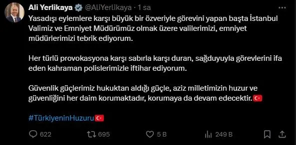 Yerlikaya, sosyal medya hesabındaki açıklamasında, yasa dışı eylemlere karşı görevini büyük bir özveriyle gerçekleştiren başta İstanbul Valisi Davut Gül ve Emniyet Müdürü Selami Yıldız olmak üzere valiler ile emniyet müdürlerinin çalışmalarını takdirle karşıladığını belirtti.