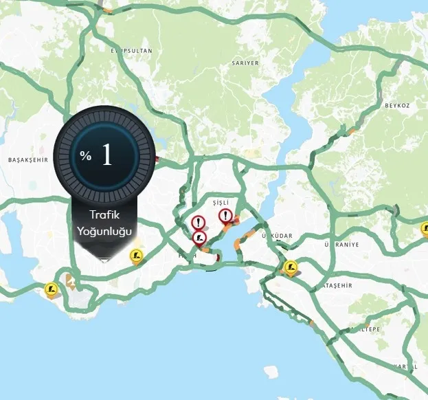 İstanbul'da İBB'nin trafik haritasına göre, saat 19.30 sıralarında yoğunluk yüzde 1 olarak ölçüldü.