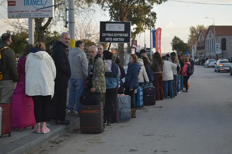 9 günlük bayram tatilini Ege'deki Yunan adalarında geçirmek isteyen tatilciler, Ayvalık Deniz Hudut Kapısı önünde uzun kuyruklar oluşturdu.
