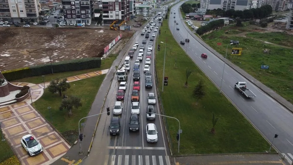 Bölgedeki trafik yoğunluğu dron ile görüntülendi. Görüntülerde araç trafiğinin özellikle kavşak noktalarında sıkıştığı ve zaman zaman durma noktasına geldiği görülüyor.
