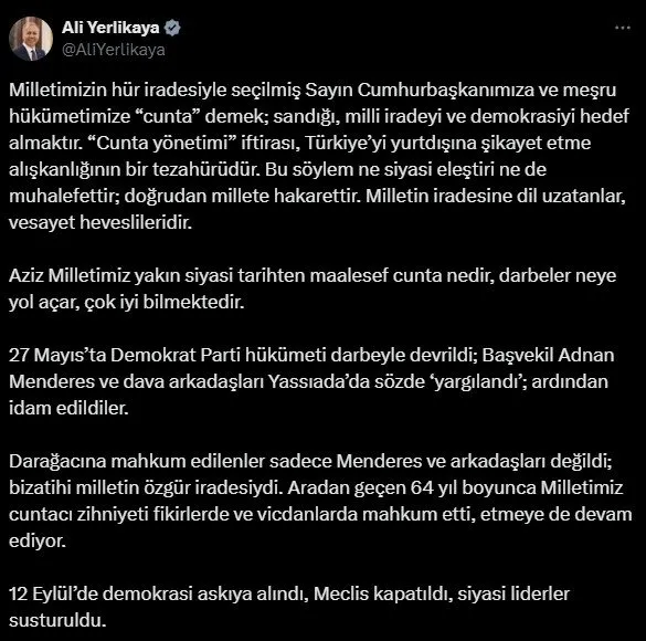 "Siz o cuntacılık işlerini bizden iyi bilirsiniz. Milletin helal oylarıyla seçilmiş Cumhurbaşkanımıza 'cuntacı' demek, ancak sırtını vesayete dayayanların dilidir. Kişi kendinden bilir işi. Milletin iradesini yok sayanlar, bu millete hem özür hem de ahlaklı siyaset borçlular."