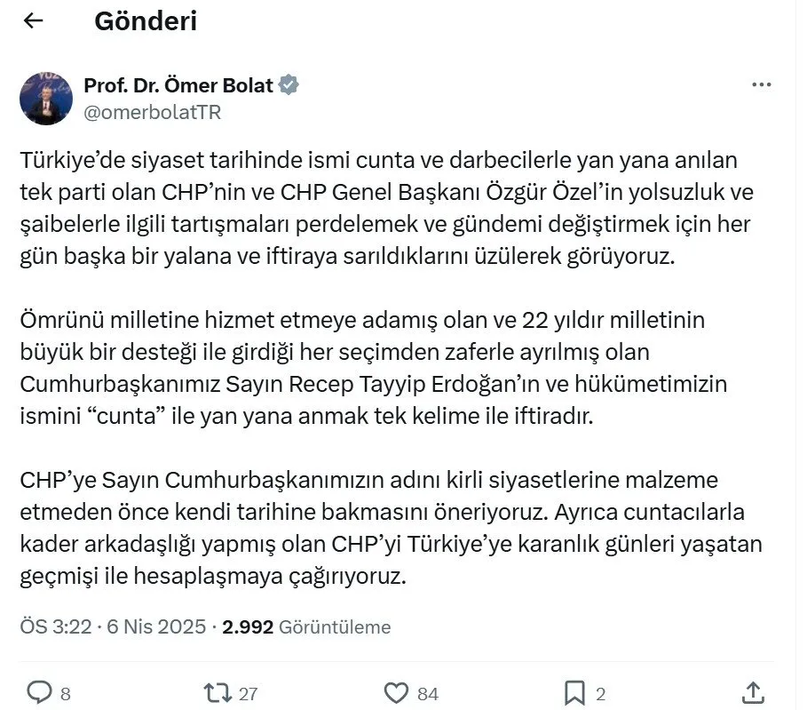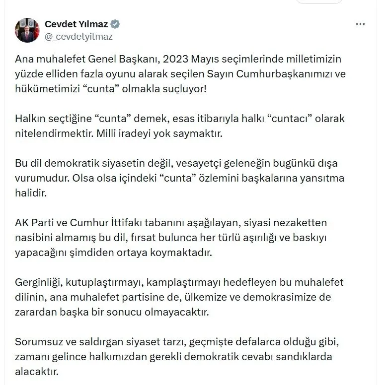 "Cunta görmek isteyenlerin demokrasiden uzak, kavga ve kaosun, siyasi çıkarların, iradesine ipotek konulan delegelerin yer aldığı kurultaylara bakması yeterlidir. Tarih boyunca darbelerle, cunta ve vesayet düzeniyle anılan bir partinin Genel Başkanına aynaya bakmasını tavsiye ediyoruz. Kendisinin ve yakın çevresinin siyasi menfaat için sınır tanımaz davranışları ve yaptıkları sokak çağrıları, demokratik zeminden uzaklaşmanın ve vesayet özlemlerinin apaçık göstergesidir. Ülkemizin ilerleyişini kirli yollarla durdurmak isteyenler şunu iyi bilmelidir ki Cumhurbaşkanımız Sayın Recep Tayyip Erdoğan liderliğinde, milletimizin güveni ve desteğiyle, tarımdan sanayiye, her alanda ülkemizi Türkiye Yüzyılı hedeflerine ulaştırmak için var gücümüzle çalışacağız."