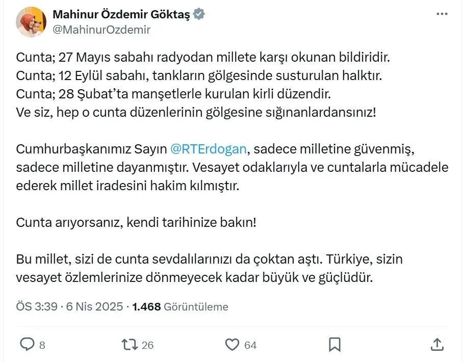 Aile ve Sosyal Hizmetler Bakanı Mahinur Özdemir Göktaş: Cunta; 27 Mayıs sabahı radyodan millete karşı okunan bildiridir. Cunta; 12 Eylül sabahı, tankların gölgesinde susturulan halktır. Cunta; 28 Şubat’ta manşetlerle kurulan kirli düzendir. Ve siz, hep o cunta düzenlerinin gölgesine sığınanlardansınız!