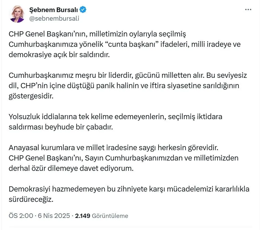 AK Parti İzmir Milletvekili Şebnem Bursalı: CHP Genel Başkanı’nın, milletimizin oylarıyla seçilmiş Cumhurbaşkanımıza yönelik “cunta başkanı” ifadeleri, milli iradeye ve demokrasiye açık bir saldırıdır.