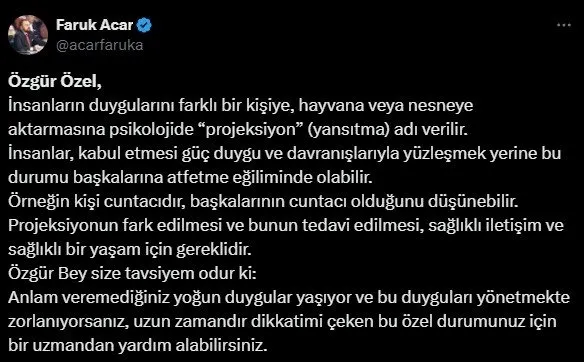 AK Parti Genel Başkan Yardımcısı Faruk Acar, Özgür Özel'e bir uzmandan yarım alma tavsiyesinde bulundu.