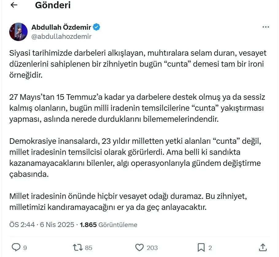 AK Parti İstanbul İl Başkanı Abdullah Özdemir, "Demokrasiye inansalardı, 23 yıldır milletten yetki alanları “cunta” değil, millet iradesinin temsilcisi olarak görürlerdi" diyerek Özgür Özel'e tepki gösterdi.