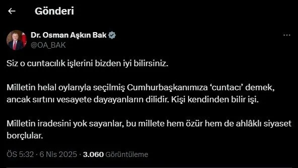 Bak, sosyal medya hesabından yaptığı açıklamada, CHP Genel Başkanı Özgür Özel'in partisinin 21. Olağanüstü Kurultayı'nda sarf ettiği, Başkan Recep Tayyip Erdoğan ve hükümete yönelik sözlerine tepki gösterdi.