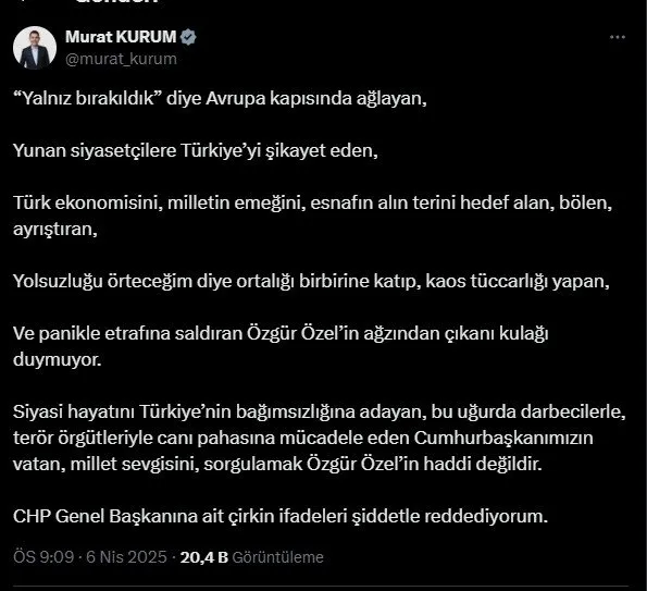 Anayasal kurumlara ve millet iradesine saygı herkesin görevidir. CHP Genel Başkanı’nı, Sayın Cumhurbaşkanımızdan ve milletimizden derhal özür dilemeye davet ediyorum.