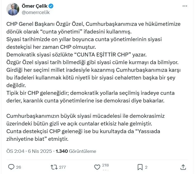 CHP Genel Başkanı Özgür Özel partisinin olağanüstü kurultayında girdiği her seçimden alnının akıyla çıkan Başkan Recep Tayyip Erdoğan'a "cuntacı" deyip milli iradeyi hedef aldı. Özel'e AK Parti'den ve kabine üyelerinden peş peşe çok sert tepki geldi. AK Parti Sözcüsü Ömer Çelik, Özgür Özel'i "Kötü niyetli bir siyasi cahil" olarak tanımlayıp "Demokratik siyasi sözlükte "CUNTA EŞİTTİR CHP" yazar" dedi.