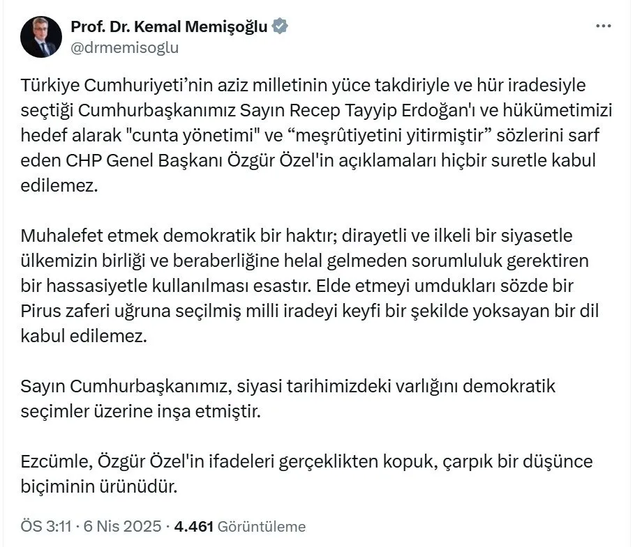 Sağlık Bakanı Kemal Memişoğlu: Türkiye Cumhuriyeti’nin aziz milletinin yüce takdiriyle ve hür iradesiyle seçtiği Cumhurbaşkanımız Sayın Recep Tayyip Erdoğan'ı ve hükümetimizi hedef alarak "cunta yönetimi" ve “meşrûtiyetini yitirmiştir” sözlerini sarf eden CHP Genel Başkanı Özgür Özel'in açıklamaları hiçbir suretle kabul edilemez.