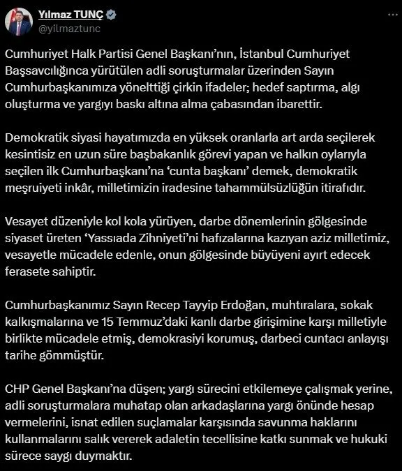 "Milli iradeyi içine sindiremeyenlerin milletimiz nezdinde yeri yoktur. CHP, suçüstü yakalanmanın paniğini yaşamaktadır. Yolsuzluk iddialarına tek bir kelime etmeden seçilmiş Cumhurbaşkanımızı, seçilmiş iktidarı hedef almaları bu paniğin göstergesidir. Hakaret, iftira, tehdit içeren bu provokatif dille sorumluluktan kaçamazsınız. CHP'ye düşen bağımsız ve tarafsız yargının konuyu aydınlatmasını beklemektir. Bu tür savrulmalar CHP'yi iktidar yapmaz, millet nezdinde ancak itibarsızlaştırır. Anayasal kurumlara, demokrasiye, milli iradeye, meşru ve demokratik yollardan seçilen Cumhurbaşkanlığı makamına saygı, herkesin vazifesi olduğu gibi muhalefetin de vazifesidir. Ana muhalefetin Genel Başkanını, milletimizden ve Sayın Cumhurbaşkanımızdan özür dilemeye davet ediyorum. Demokrasiden yana olan herkes CHP'nin bu provokatif diline karşı durmalıdır.