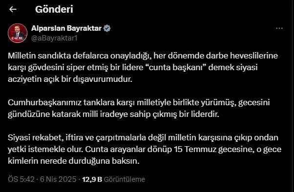 "Milletin sandıkta defalarca onayladığı, her dönemde darbe heveslilerine karşı gövdesini siper etmiş bir lidere 'cunta başkanı' demek siyasi acziyetin açık bir dışavurumudur. Cumhurbaşkanımız tanklara karşı milletiyle birlikte yürümüş, gecesini gündüzüne katarak milli iradeye sahip çıkmış bir liderdir. Siyasi rekabet, iftira ve çarpıtmalarla değil milletin karşısına çıkıp ondan yetki istemekle olur. Cunta arayanlar dönüp 15 Temmuz gecesine, o gece kimlerin nerede durduğuna baksın."