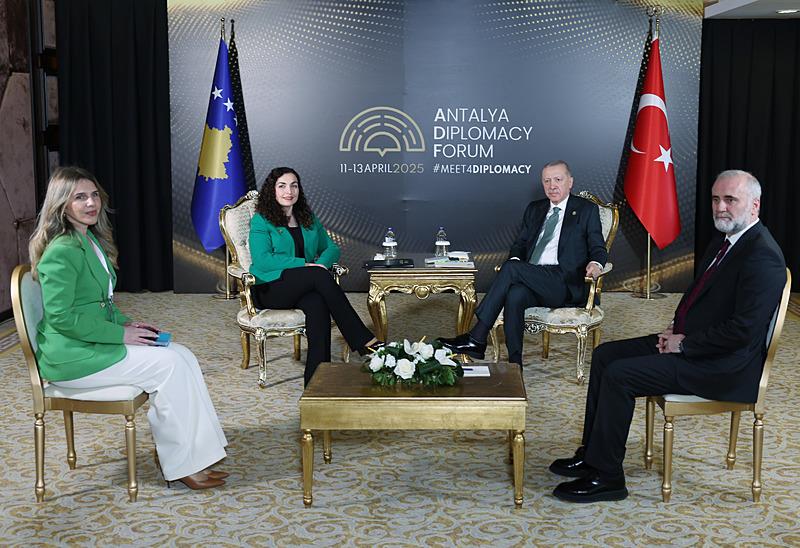 Başkan Recep Tayyip Erdoğan Antalya Diplomasi Forumu kapsamında Kosova Cumhurbaşkanı Vjosa Osmani ile görüştü. Görüşmenin ardından açıklama yapan Osmani, Erdoğan’ın dostluk ve ortak vizyonun güçlü bir sesi olduğunu vurguladı. Osmani Başkan Erdoğan için, "Kosova’nın kendini kanıtlamış bir dostu, haklı davamızın güçlü bir savunucusu ve devlet kurma sürecimizin her aşamasında sağlam bir destek sütunudur." ifadelerini kullandı.