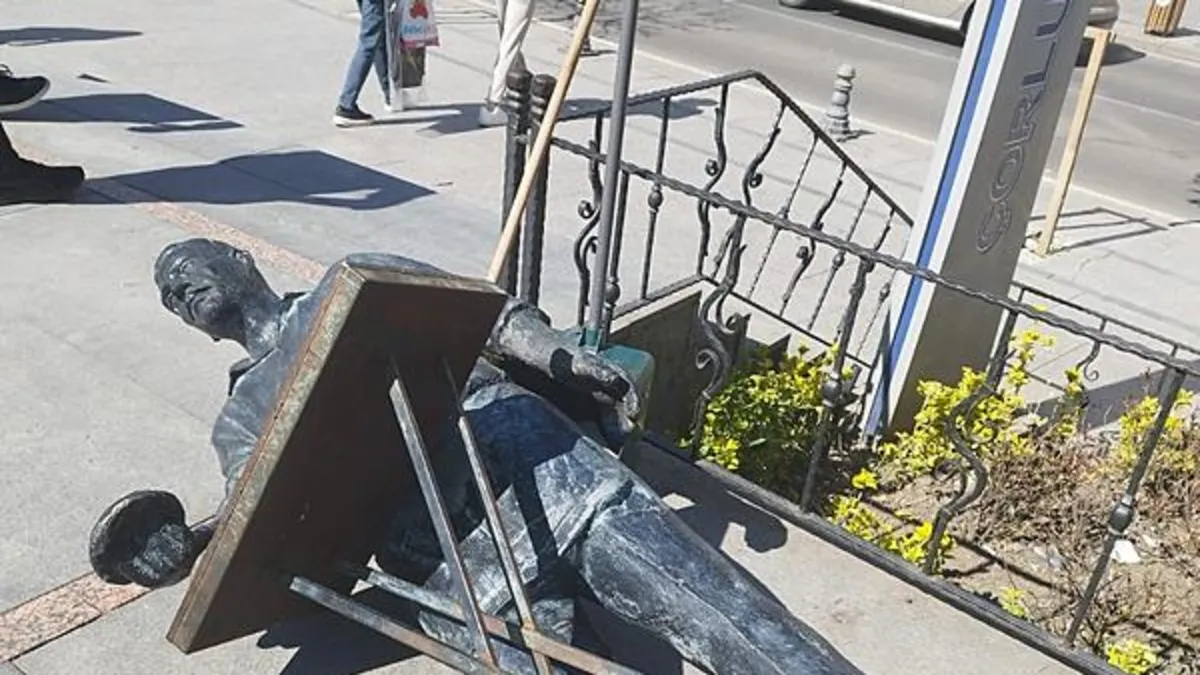 Çorlu'da simitçi heykeli depreme dayanamayıp yıkıldı