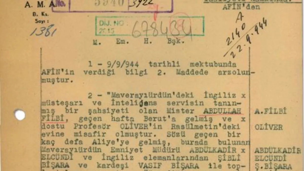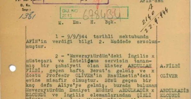 "Maverayıürdün'deki İngiliz müsteşarı ve İntelijans servisin tanınmış bir şahsiyeti olan Mister Abdullah Filbi, geçen hafta Berut'a ve dostu Profesör Oliver'in Rasülmetin'deki evine misafir olmuştur. Sözü geçen bir kaç defa Aliye'ye gelmiş, burada bulunan Maverayıürdün Emniyet Müdürü Abdülkadir Elcündi ve İngiliz elemanlarından Şibli Bişara ve kardeşi Vasıf Bişara ile toplantılar yapmıştır. Öğrendiğime göre, Şibli Bişara İntelijens servisin yakın şarktaki mühim bir elemanıdır. İngilizlerin büyük itimadını haiz bulunan bu adamın, sık sık Bağdat'a gittiği ve avdetinde İngiliz istihbarat subaylarından Kolonel Sterling'le Berut'un Senjorj otelinde temaslar yaptığı görülmüştür. Bu adamla birlikte Abdullah Filbi'nin yaptığı faaliyetin Emir Abdullah'ın Suriye'ye Kral yapılmasını istihdaf ettiği tahmin olunmaktadır. Bilgi için yüce Başkanlığa ve D. Merkezine sunulmuştur."