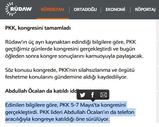 Rudaw PKK kongresine ilişkin girdiği haberinde "Üç ayrı kaynaktan" bilgi aldığını belirterek, "Edinilen bilgilere göre, PKK 5-7 Mayıs'ta kongresini gerçekleştirdi. PKK lideri Abdullah Öcalan'ın da telefon aracılığıyla kongreye katıldığı öne sürülüyor." iddiasında bulundu.