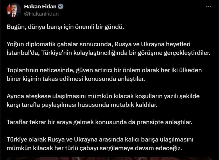 Fidan, yaptığı paylaşımda, "Bugün, dünya barışı için önemli bir gündü. Yoğun diplomatik çabalar sonucunda, Rusya ve Ukrayna heyetleri İstanbul'da, Türkiye'nin kolaylaştırıcılığında bir görüşme gerçekleştirdiler. Toplantının neticesinde, güven artırıcı bir önlem olarak her iki ülkeden biner kişinin takas edilmesi konusunda anlaştılar."ifadelerine yer verdi.