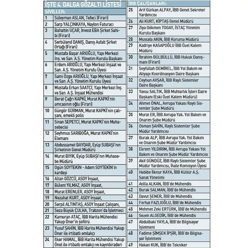 İBB'ye yapılan 4. dalga yolsuzluk operasyonunda İSTAÇ, KİPTAŞ ve Yol Bakım Daire Başkanlığında usulsüzlükler tespit edildi. İSTAÇ Yönetim Kurulu Başkanı Ziya Gökmen Togay ve KİPTAŞ Yönetim Kurulu Başkanı Ali Kurt'un da aralarında bulunduğu 45 kişi gözaltına alındı. 36 şüpheli tutuklama talebiyle Nöbetçi Sulh Ceza Hakimliğine sevk edildi. Açıklanan ilk kararlara göre aralarında KİPTAŞ Yönetim Kurulu Başkanı Ali Kurt da olan 25 şüpheli tutuklandı.