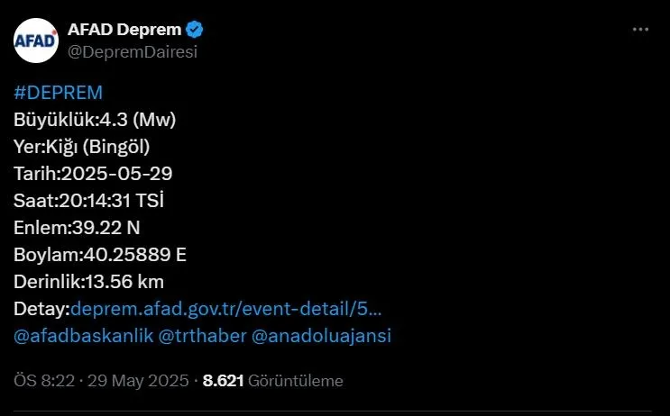 İçişleri Bakanlığı Afet ve Acil Durum Yönetimi Başkanlığı (AFAD) verilerine göre, saat 20.14'te merkez üssü Bingöl'ün Kiğı ilçesinde 4.3 büyüklüğünde deprem meydana geldi. Yerin 13.56 kilometre derinliğinde kaydedilen depremde, ilk belirlemelere göre herhangi bir olumsuzluk yaşanmadı.