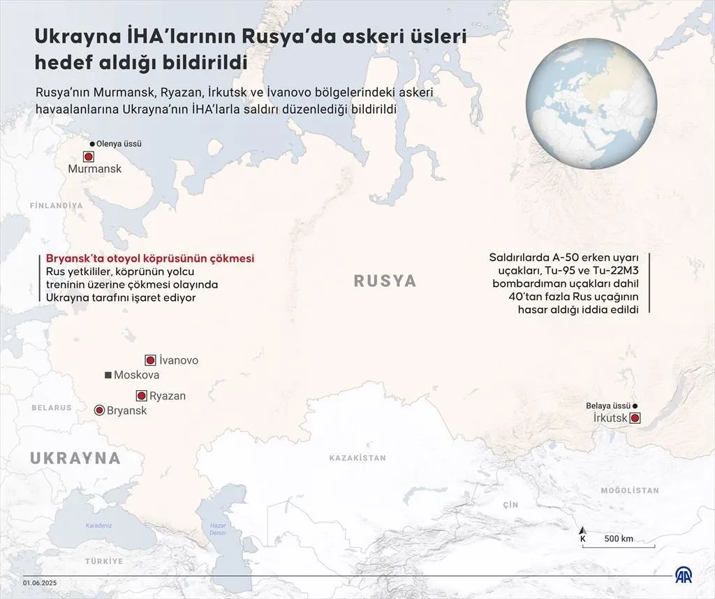 Ukrayna’nın Rusya’nın iç bölgelerindeki hava üslerine düzenlediği ve 40’tan fazla Rus bombardıman uçağını vurduğu saldırıya ilişkin yeni detaylar ortaya çıktı. Ukrayna Güvenlik Servisi (SBU) kaynaklarına dayandırılan haberlerde, Rus hava üslerine yönelik saldırıda kullanılan dronların daha önce Rusya’ya sokulduğu belirtilerek, dronların daha sonra Rusya’ya sokulan ahşap kabinler ile kamyonlara saklandığı ve bu kamyonlardan hedeflerine havalandığı aktarıldı. Saldırıya "Örümcek Ağı Operasyonu"adı verildiği ifade edilen haberlerde, saldırının 1,5 yıl planlandığı ve Ukrayna Devlet Başkanı Vladimir Zelenskiy tarafından bizzat yönetildiği aktarıldı. Ukrayna’nın düzenlediği saldırıda A-50, Tu-95 ve Tu-22 M3 dahil olmak üzere 40’tan fazla uçağın vurulduğu belirtilerek, saldırıların Rusya’ya 2 milyar dolar zararı olduğu iddia edildi.