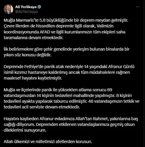 İçişleri Bakanı Ali Yerlikaya sosyal medya hesabı üzerinden açıklamada bulunarak, "Muğla Marmaris’te 5.8 büyüklüğünde bir deprem meydan gelmiştir. Çevre illerden de hissedilen depremle ilgili olarak, Valimizin koordinasyonunda AFAD ve ilgili kurumlarımızın tüm ekipleri saha taramalarına devam etmektedir.