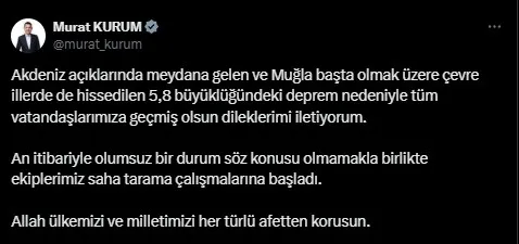 Çevre, Şehircilik ve İklim Değişikliği Bakanı Murat Kurum, sosyal medya hesabından yaptığı paylaşımda, Akdeniz açıklarında meydana gelen ve Muğla başta olmak üzere çevre illerde de hissedilen 5.8 büyüklüğündeki deprem nedeniyle tüm vatandaşlara geçmiş olsun dileklerini iletti.