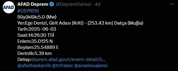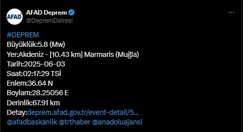 "Dün gece (03.07.2025) saat 02.17'de Muğla, Marmaris açıklarında meydana gelen 5.8 büyüklüğündeki deprem sonrası ilgili tüm kurumlarımız tarafından çalışmalar devam ediyor. Deprem, Muğla, Aydın, Denizli, İzmir ve Manisa illerimizde hissedilmiştir. Depremin hemen ardından Türkiye Afet Müdahale Planı (TAMP) kapsamında ilgili kurumlarımız tarafından saha tarama çalışmalarına başlanmış olup depremin etkili olduğu illerimizde hasar tespit çalışmaları devam etmektedir.