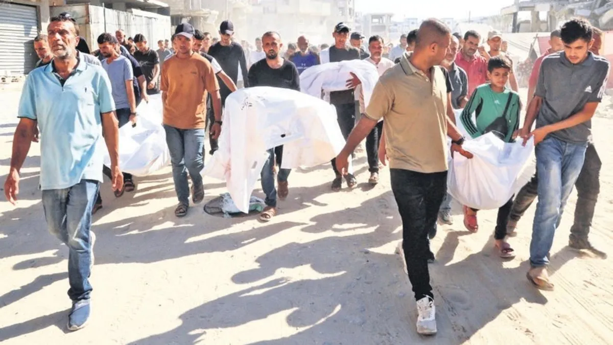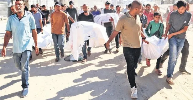 Gazzeliler de şehitlerini toprağa vermek için cenaze arabası bile bulamadan mezarlığa doğru ilerliyorlar.