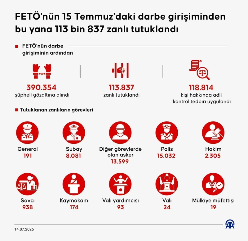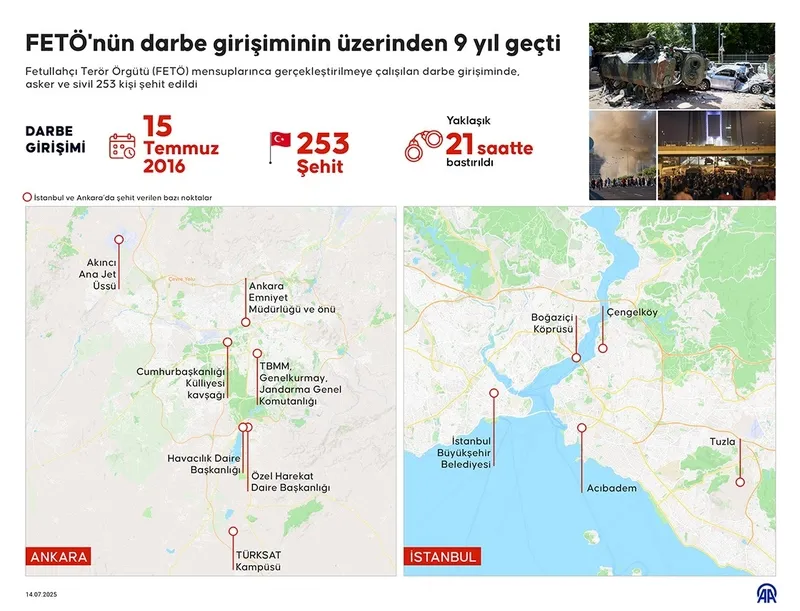 Fetullahçı Terör Örgütü'nün (FETÖ) 15 Temmuz 2016'da giriştiği hain darbe girişiminin üzerinden 9 yıl geçti.