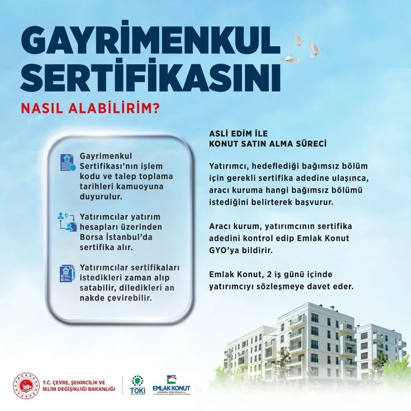 Çevre, Şehircilik ve İklim Değişikliği Bakanlığı, vatandaşlara küçük birikimlerle konut projesine ortak olma imkanı sunan Gayrimenkul Sertifikası projesini hayata geçiriyor.