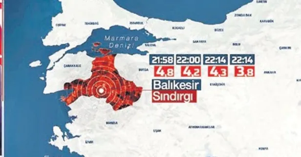 Balıkesir'in Sındırgı ilçesinde 10 Ağustos'taki 6.1'lik depremin ardından dün akşam da saat 21.58'de 4.8 büyüklüğünde deprem meydana geldi. Yerin 7 kilometre derinliğinde gerçekleşen deprem, İstanbul'da da hissedildi. Peşi sıra 4.2, 4.3, 3.8 büyüklüğünde sarsıntı gerçekleşti. Depremlerde herhangi bir can veya mal kaybı yaşanmadı.