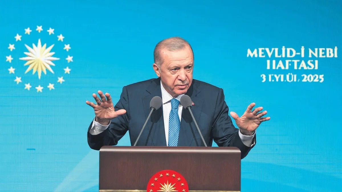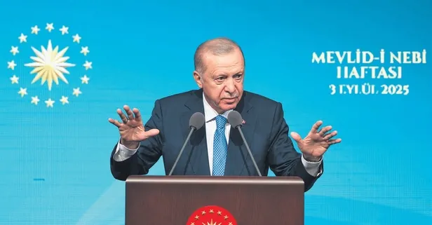 Başkan Erdoğan şöyle devam etti: ''Peygamber efendimizin aile hayatını daha fazla örnek almalıyız. Şu anda bizleri, ümmet şuuruyla kalplerimizi birleştiren, bizi birbirimize kenetleyen bağ, Muhammedi bir muhabbet bağıdır. Dünyanın neresinde bir Müslüman varsa, gönlümüz, aklımız, ruhumuz oradadır. Tüm müslümanları bir bedenin azaları, bir tarağın dişleri, bir binanın tuğlaları olarak görürüz. Şu an kalbimizin yarısı buradaysa diğer yarısı İslam dünyasının kanayan yaraları olan Gazze'de, Filistin'de, Yemen, Sudan, Afganistan'dadır. Şu anda Filistin'de olan, bu Netanyahu denilen gaddarın, kafirin o kıyımına asla seyirci kalamayız. Bugün çekilen çileler bitecek, zulmün karanlığı yerini adaletin gönüllerimizi ısıtan güneşine bırakacaktır.''