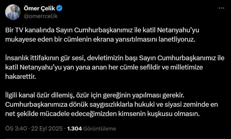 "Bir TV kanalında Sayın Cumhurbaşkanımız ile katil Netanyahu'yu mukayese eden bir cümlenin ekrana yansıtılmasını lanetliyoruz. İnsanlık ittifakının gür sesi, devletimizin başı Sayın Cumhurbaşkanımız ile katil Netanyahu'yu yan yana anan her cümle sefildir ve milletimize hakarettir. İlgili kanal özür dilemiş, özür için gereğinin yapılması gerekir. Cumhurbaşkanımıza dönük saygısızlıklarla hukuki ve siyasi zeminde en net şekilde mücadele edeceğimizden kimsenin kuşkusu olmasın."