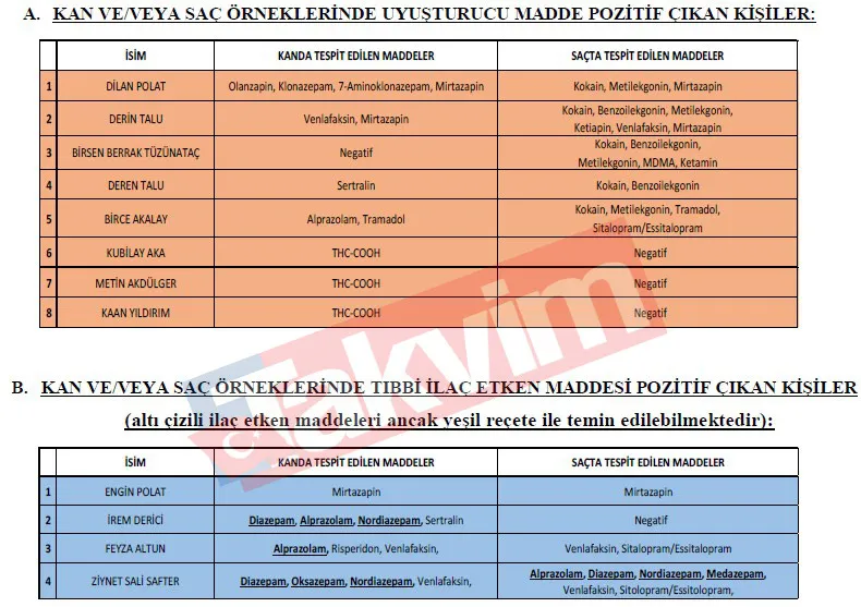 Kan ve/veya saç örneklerinde uyuşturucu madde pozitif çıkan isimler ve tespit edilen maddeler şu şekilde:
