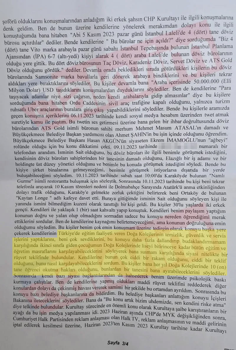 Dursun, Durmaz Ailesi'nin sahibi olduğu Taç Döviz için "Milyonlarca dolar ve Euro'nun zemin katta bulunan (bodrum kat) Taç Döviz'in gizli mahseninde ve Aksaray'da bulunan Durmaz Otel'in onlarca devasa kasalarında olduğunu bildiriyorum" şeklinde beyan vermesi dikkat çekti.