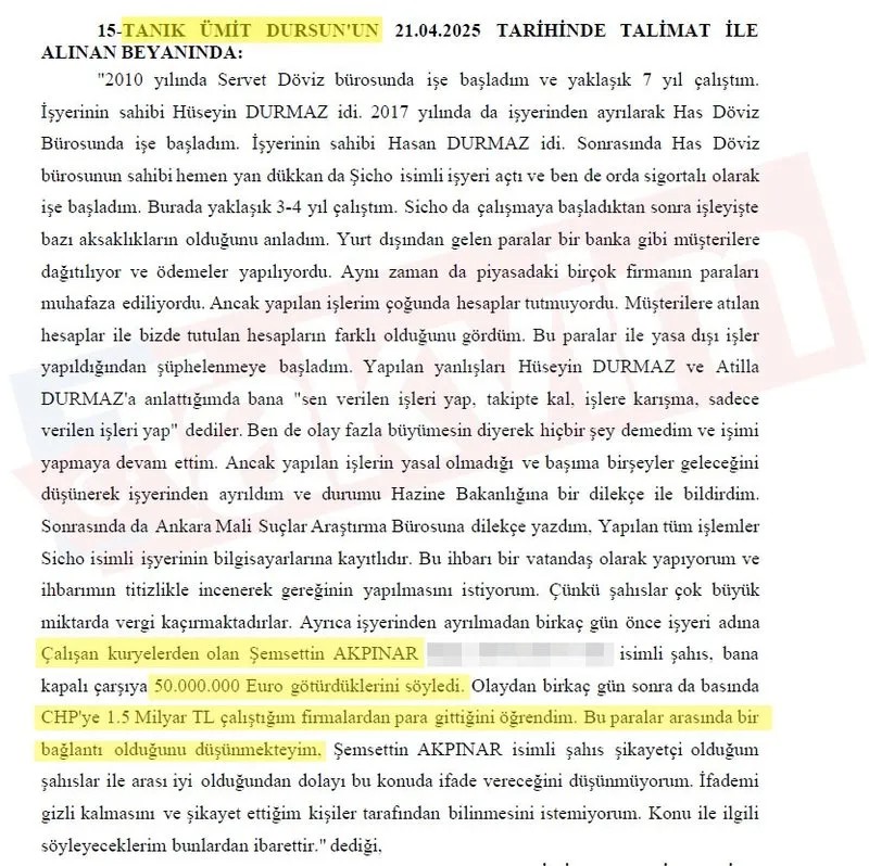 Bahse konu döviz bürolarında geçmişte çalışan Ümit Dursun isimli şahsın savcılık ifadesinde de dikkat çekici detaylar mevcut.