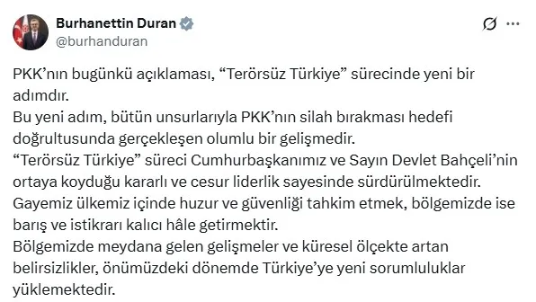 PKK'nın bugünkü açıklaması, "Terörsüz Türkiye" sürecinde yeni bir adımdır. Bu yeni adım, bütün unsurlarıyla PKK'nın silah bırakması hedefi doğrultusunda gerçekleşen olumlu bir gelişmedir. "Terörsüz Türkiye" süreci Cumhurbaşkanımız ve Sayın Devlet Bahçeli'nin ortaya koyduğu kararlı ve cesur liderlik sayesinde sürdürülmektedir. Gayemiz ülkemiz içinde huzur ve güvenliği tahkim etmek, bölgemizde ise barış ve istikrarı kalıcı hâle getirmektir. Bölgemizde meydana gelen gelişmeler ve küresel ölçekte artan belirsizlikler, önümüzdeki dönemde Türkiye'ye yeni sorumluluklar yüklemektedir. "Terörsüz Türkiye" ve "terörsüz bölge" politikalarını kararlılıkla sürdürmek hem bu sorumlukları yerine getirmek hem de "güçlü Türkiye" idealine yürümek için vazgeçilmez önemdedir.