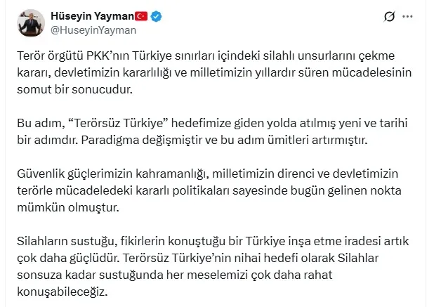 AK Parti Hatay Milletvekili ve TBMM Milli Dayanışma, Kardeşlik ve Demokrasi Komisyonu Başkanı Hüseyin Yayman, terör örgütü PKK'nın Türkiye sınırları içindeki silahlı unsurlarını çekme kararının, devletin kararlılığı ve milletin yıllardır süren mücadelesinin somut bir sonucu olduğunu belirtti.