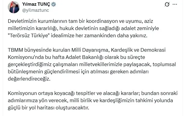 Adalet Bakanı Yılmaz Tunç, devletin tüm kurumlarının tam bir koordinasyon ve uyum içinde çalıştığını belirterek, "Aziz milletimizin kararlılığı ve hukuk devletinin sağladığı adalet zeminiyle 'Terörsüz Türkiye' idealimize her zamankinden daha yakınız." ifadelerini kullandı.