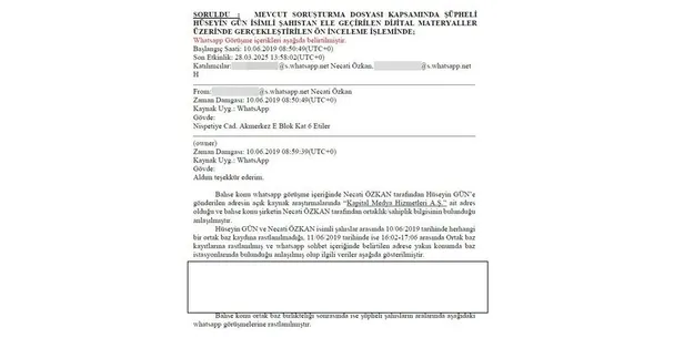 10 Haziran 2019 tarihli mesajlaşmada Necati Özkan, Hüseyin Gün'e "Nispetiye Cad. Akmerkez E Blok Kat 6 Etiler" adresini gönderdi. Hüseyin Gün ise bu mesaja "Aldım, teşekkür ederim" yanıtını verdi.