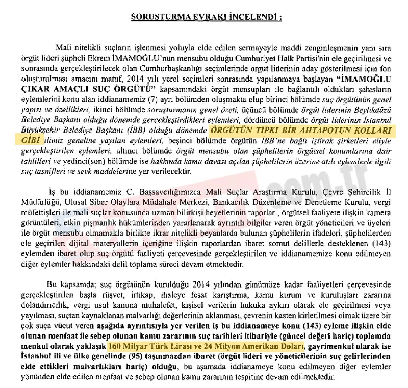 "İddianamede örgütün kurucusu ve elebaşı şüpheli Ekrem İmamoğlu hakkında, doğrudan işlediği suçlar olan 'suç işlemek amacıyla örgüt kurma', 'rüşvet' (12 kez), 'suç gelirlerinin aklanması' (7 kez), 'kamu kurum ve kuruluşları zararına dolandırıcılık' (7 kez) suçlarından, suç örgütünün kurucusu ve lideri olması dolayısıyla 5237 sayılı Türk Ceza Kanunu'nun 220/5'inci maddesi uyarınca örgütün faaliyeti çerçevesinde örgüt mensupları tarafından işlenen 'kişisel verilerin kaydedilmesi' (2 kez), 'kişisel verileri ele geçirme ve yayma' (2 kez), 'suç delilerini gizleme' (4 kez), 'haberleşmenin engellenmesi', 'kamu malına zara verme', 'rüşvet alma' (47 kez), 'halkı yanıltıcı bilgiyi alenen yayma', 'irtikap' (9 kez), 'kamu kurum ve kuruluşları zararına dolandırıcılık' (39 kez), 'suçtan kaynaklanan mal varlığı değerlerini aklama' (4 kez), 'ihaleye fesat karıştırma (70 kez), 'çevre kasten kirletilmesi', 'Vergi Usul Kanunu'na muhalefet', 'Orman Kanunu'na Muhalefet, Maden Kanunu'na muhalefet' suçlarından olmak üzere toplamda iddianameye konu 142 eylemle ilgili olarak cezalandırma talep edilmiştir."