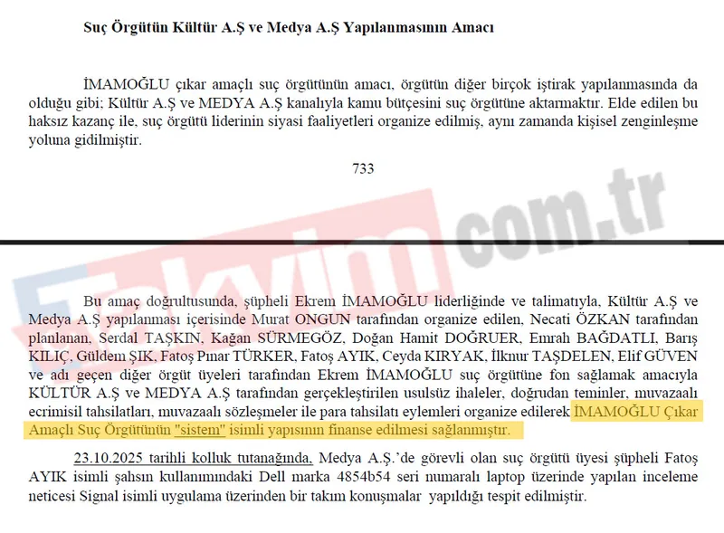 Bu amaç doğrultusunda, şüpheli Ekrem İMAMOĞLU liderliğinde ve talimatıyla, Kültür A.Ş ve Medya A.Ş yapılanması içerisinde Murat ONGUN tarafından organize edilen, Necati ÖZKAN tarafından planlanan, Serdal TAŞKIN, Kağan SÜRMEGÖZ, Doğan Hamit DOĞRUER, Emrah BAĞDATLI, Barış KILIÇ, Güldem ŞIK, Fatoş Pınar TÜRKER, Fatoş AYIK, Ceyda KIRYAK, İlknur TAŞDELEN, Elif GÜVEN ve adı geçen diğer örgüt üyeleri tarafından Ekrem İMAMOĞLU suç örgütüne fon sağlamak amacıyla KÜLTÜR A.Ş ve MEDYA A.Ş tarafından gerçekleştirilen usulsüz ihaleler, doğrudan teminler, muvazaalı ecrimisil tahsilatları, muvazaalı sözleşmeler ile para tahsilatı eylemleri organize edilerek İMAMOĞLU Çıkar Amaçlı Suç Örgütünün ''sistem'' isimli yapısının finanse edilmesi sağlanmıştır.
