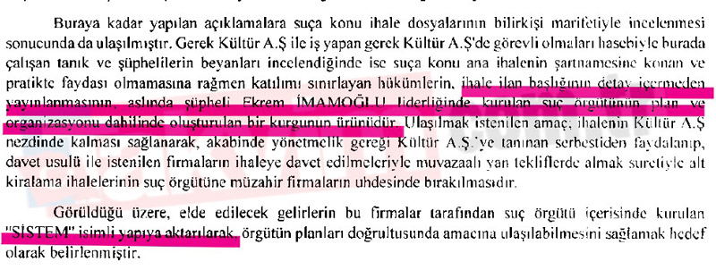 "Gerek Kültür AŞ ile iş yapan gerek Kültür AŞ'de görevli olmaları hasebiyle burada çalışan tanık ve şüphelilerin beyanları incelendiğinde ise suça konu ana ihalenin şartnamesine konan ve pratikte faydası olmamasına rağmen katılımı sınırlayan hükümlerin, ihale ilan başlığının detay içermeden yayınlanmasının, aslında şüpheli Ekrem İmamoğlu elebaşılığında kurulan suç örgütünün plan ve organizasyonu dahilinde oluşturulan bir kurgunun ürünüdür. Ulaşılmak istenilen amaç, ihalenin Kültür AŞ nezdinde kalması sağlanarak, akabinde yönetmelik gereği Kültür AŞ'ye tanınan serbestiden faydalanıp, davet usulü ile istenilen firmaların ihaleye davet edilmeleriyle muvazaalı yan tekliflerde almak suretiyle alt kiralama ihalelerinin suç örgütüne müzahir firmaların uhdesinde bırakılmasıdır. Görüldüğü üzere, elde edilecek gelirlerin bu firmalar tarafından suç örgütü içerisinde kurulan 'sistem' isimli yapıya aktarılarak, örgütün planları doğrultusunda amacına ulaşılabilmesini sağlamak hedef olarak belirlenmiştir."