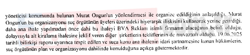 İBB tarafından yapılan ana ihalelerin ve daha sonrasında bu ihaleye bağlı olarak 4734 Sayılı Yasanın ilgili maddesi kapsamında davet usulüyle yapılan alt kiralama ihalelerin daha en başından suç örgütü elebaşı Ekrem İmamoğlu'nun talimatı ve suç örgülünün yöneticisi konumunda bulunan şüpheli Murat Ongun'un yönlendirmesiyle organize edildiği kaydedilen iddianamede, Ongun'un bu organizasyonu suç örgütünün üyeleri üzerindeki hiyerarşik ilişkisini kullanarak yerine getirdiği belirtildi.